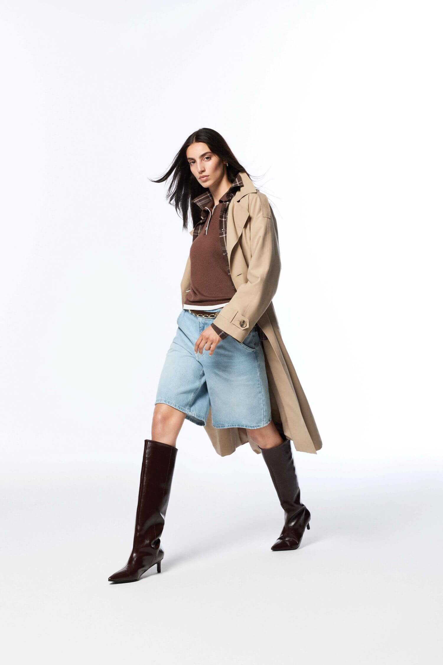 - Kadınlar ise kısa modellerde çoğunlukla pantolon giymeyi tercih ediyor. Özellikle üst bacaklara oturan pantolonlar, trençkotun bel kıvrımını ortaya çıkaran kemerli görünümüne uyum sağlıyor. Kum saati görünümünü destekleyen bu birliktelik geniş omuzların dengelenmesi için geniş paçalarla son buluyor. Topuklu botlar ile kombine son dokunuşu yapabilirsiniz. İddialı bir görünüm için bu kombini gümüş rengi büyük halka küpelerle ayrıcalıklı kılın!