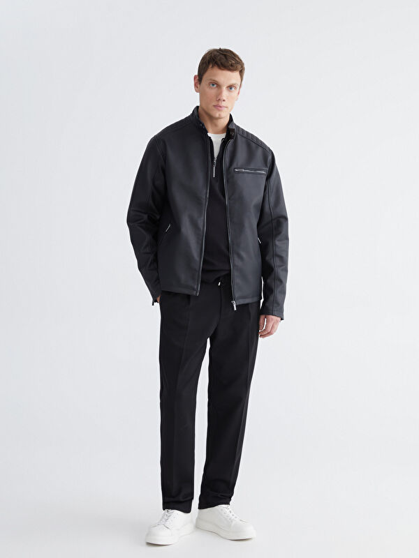 Standart Kalıp Dik Yaka Erkek Deri Görünümlü Mont