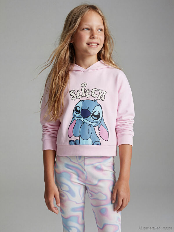 Kapüşonlu Stitch Baskılı Kız Çocuk Sweatshirt