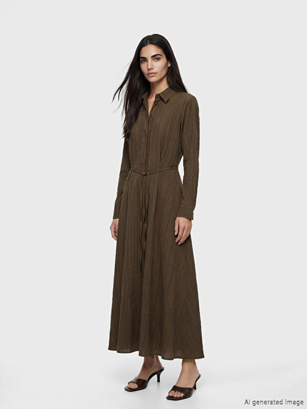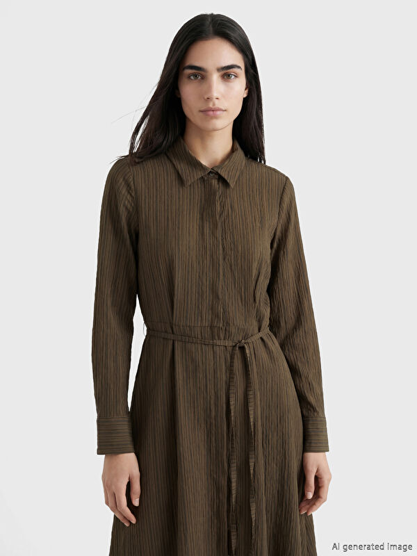 Çizgili Kuşaklı Armürlü Gömlek Elbise